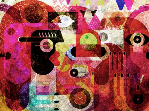 Colourful graffiti with faces in a vintage look. The colours create a vintage look in the room.