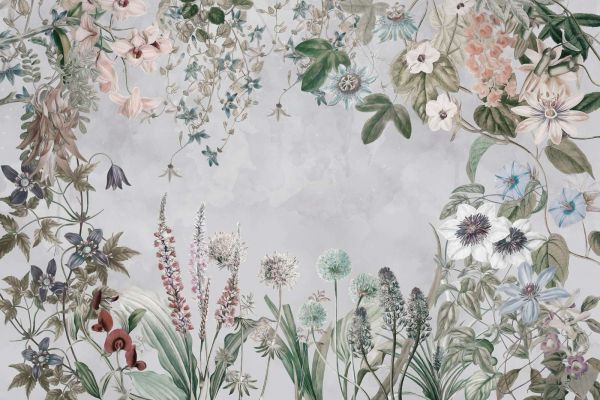 This design radiates an enchanting beauty through a harmonious mix of flowers and plants, reflecting both elegance and playfulness. The rich details in the leaves and blossoms, combined with a subtle palette of pastel colors and soft earth tones, make it lively and refined. The graceful composition creates an inviting atmosphere, perfect for spaces that require a calm and natural appearance.