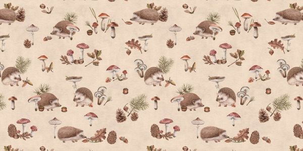 A cute pattern with hedgehogs amidst autumn mushrooms, pine cones, and acorns. The soft taupe background and detailed illustrations create a warm, woodland atmosphere, ideal for adding a cozy and playful accent to any space.