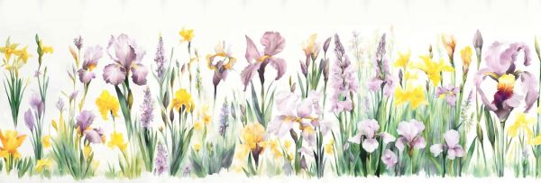 A playful combination of colorful irises and wildflowers in bright watercolor tones. The deep blue shades and sunny yellow accents dance on a light background, creating a breezy and fresh appearance. This design radiates cheerfulness and elegance, perfect for a cozy and light interior.