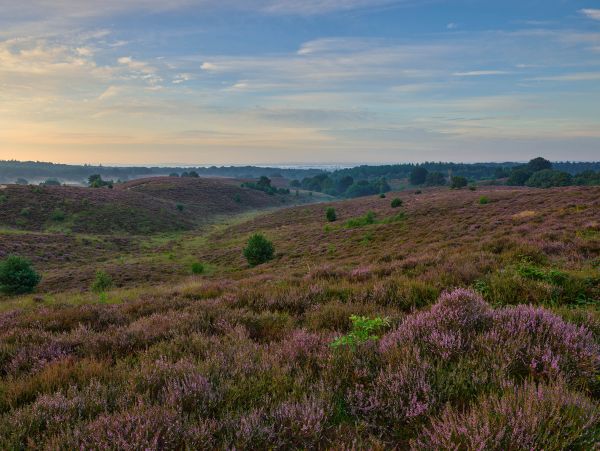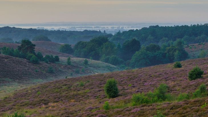 Flowering heather on the hills. In the distance, a morning mist still hangs over the heath.
