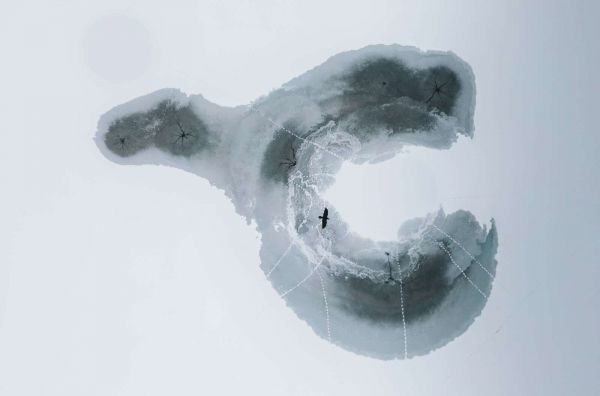 A breathtaking abstract winter landscape in which the ice has taken on an almost extraterrestrial shape. A solitary bird hovers above the frozen water, while subtle traces of animals tell a story of movement and life. The cool tones and organic shapes create a dreamy, serene atmosphere.
