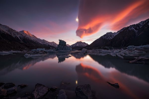 A sunset by a lake with the ice still in it. The mountains in the background are snow-covered.