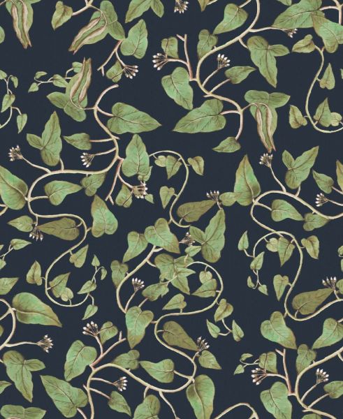 This rich, botanical design features vibrant bean vines gracefully spreading across a deep midnight blue background. The fresh green leaves and white flowers are depicted with refined brush strokes, creating an illustrative yet realistic appearance. The contrasting colors enhance the play between light and dark, making the design feel both dynamic and soothing.