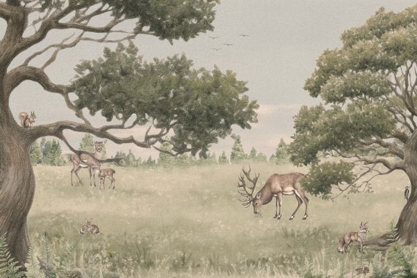 This beautiful wallpaper design brings the beauty of nature to your interior. The landscape with animals in beige shows a serene environment with soft earth tones. Whether you want to add a nature theme to your living room, bedroom or office, this wallpaper is the perfect choice.