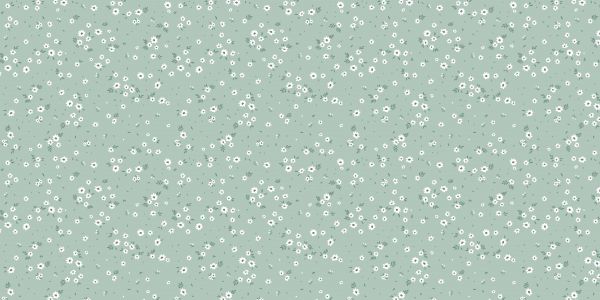 Against a calm mint green background, small white blossoms bring a subtle liveliness reminiscent of a lush flower garden in spring.
