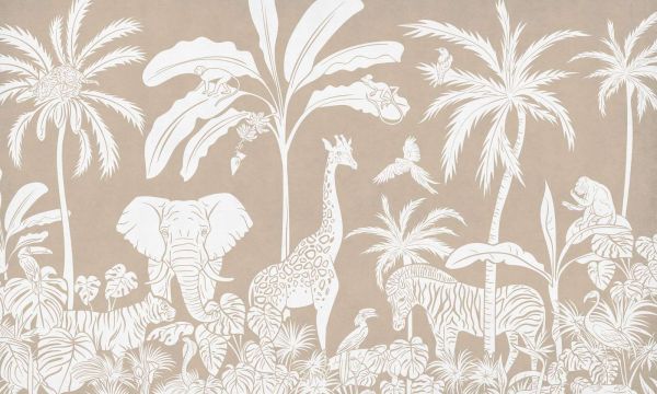 An exotic landscape full of wild animals such as elephants, giraffes, zebras, and monkeys, framed by lush tropical plants. The soft color in the background and illustrations give the whole a serene appearance.
