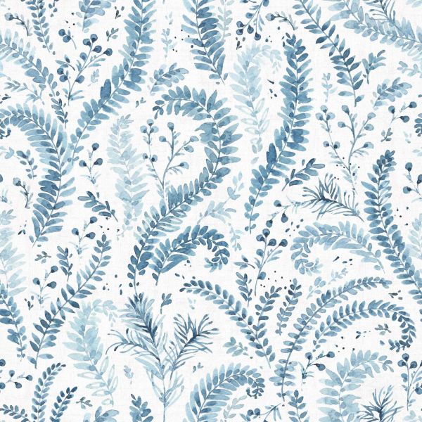 An airy pattern of watercolor-painted ferns and berry branches in soft blue tones on a light linen-like background. The whole exudes tranquility and natural elegance.