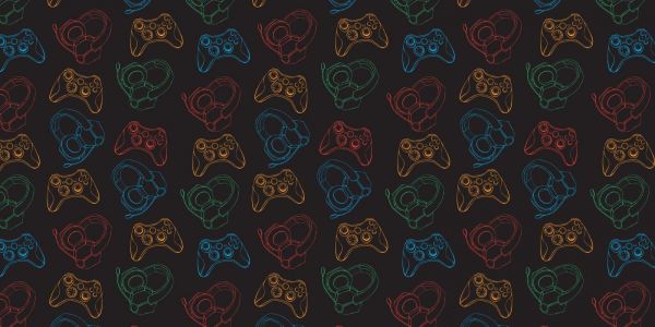 A modern and playful gaming design with neon-like line drawings of game controllers and headsets on a dark background. The colorful red, blue, green, and yellow contours give an energetic and futuristic look, perfect for a stylish gaming room.