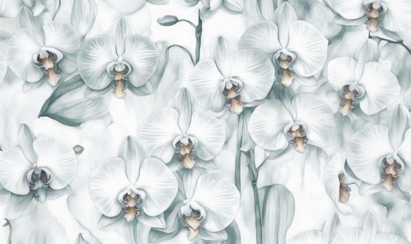 The orchids in this design seem to almost float in a soft cloud of pastel shades. White petals smoothly transition into nuances of lilac, pink, and mint green, creating a harmonious and calming atmosphere. The light, watercolor-like finish emphasizes the dreamy quality of the whole. This design is particularly suitable for romantic or shabby-chic interiors, where it adds a soft, almost fairy-tale charm. Combine with pastel-colored cushions, curtains, and accessories for a lovely whole, or place it in a sleek and modern interior as a subtle accent that brings softness and warmth. The refreshing combination of shades fits well in spaces where tranquility and well-being are central, such as bedrooms, children's rooms, or a cozy reading nook. The powdery colors also have a brightening effect in smaller spaces, as they enhance the feeling of space and light. Use neutral base colors to keep the focus on the orchids, or dare to experiment with other pastel shades for a playful and harmonious effect.