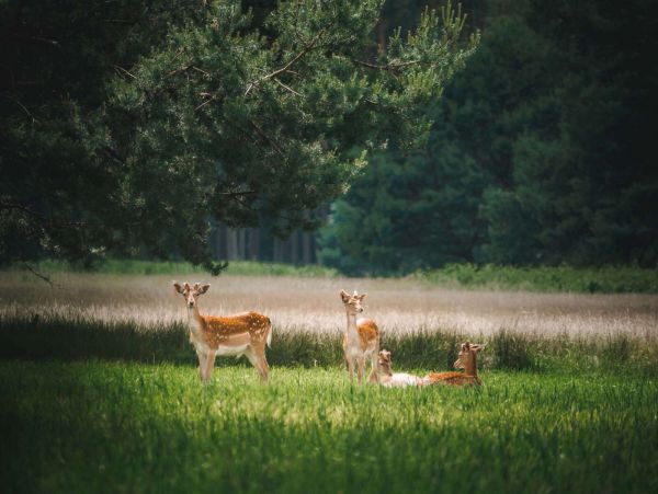 This image captures a beautiful, calming moment in nature. A group of deer lies relaxed in the grass, basking in soft sunlight, while the surrounding trees cast a soothing shadow. The deep green tones of the forest contrast beautifully with the warm coats of the animals, creating a harmonious and balanced composition. This design fits perfectly in a rustic or botanical interior. It brings a touch of wild nature into the home and creates a soothing atmosphere in living rooms, bedrooms, or workspaces. Combined with natural wood tones and soft, neutral colors, this image provides a warm and inviting ambiance. For nature lovers and seekers of tranquility, this image is a timeless and atmospheric artwork. It evokes a sense of freedom and connection with nature, perfect for bringing a space to life.
