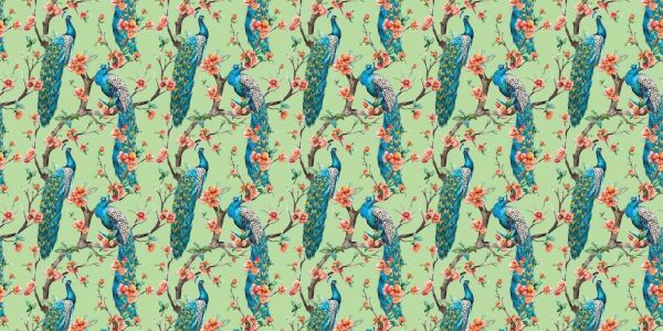 This vibrant illustration shows elegant peacocks spread over a soft green background, surrounded by blooming tree branches with pink and orange blossoms.
