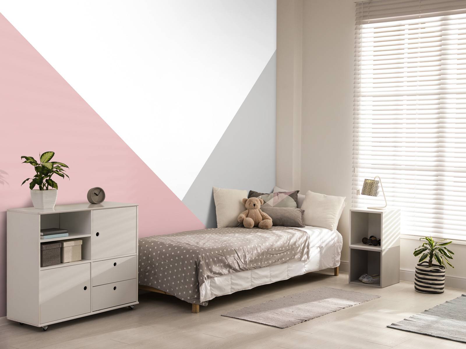 Geometric triangles in pink and grey with an asymmetrical white plane at the top.