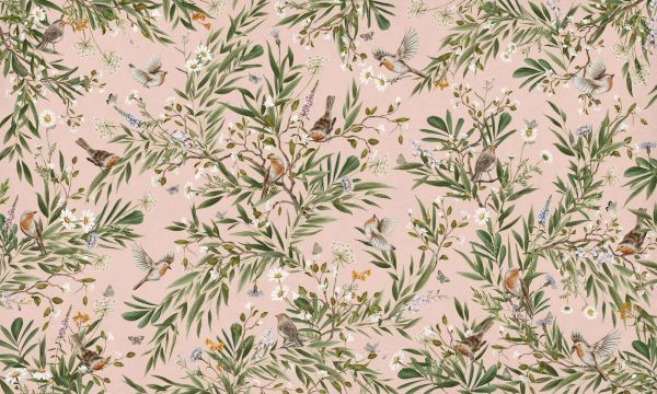 The color combination of powder pink, fresh green, warm orange-brown, and accents of white and soft purple give this design a soft and natural look. The songbirds bring movement and cheerfulness, without disrupting the calming character of the whole.