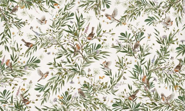 This fresh and vibrant design brings the feeling of a summer flower meadow directly indoors. On a light, almost cream background, you see robins freely moving between a wealth of green leaves, soft flowers in white, lilac, and orange, and fluttering butterflies. The leaves are realistically depicted in various shades of green, ranging from olive to fresh grass green, giving the whole a botanical and lively character.