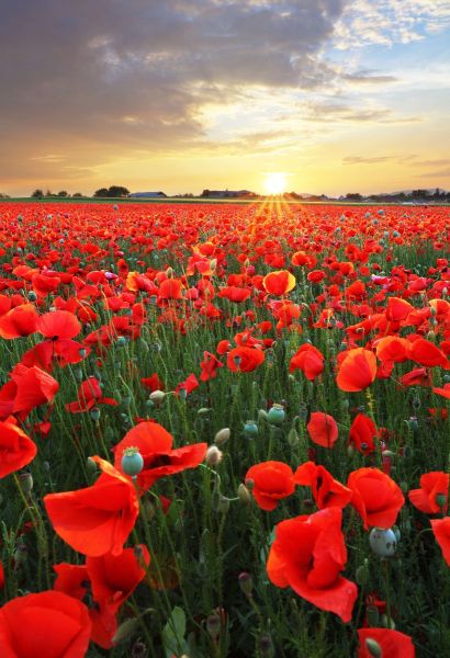 Portrait photo of a field full of poppies with a setting sun in the background.