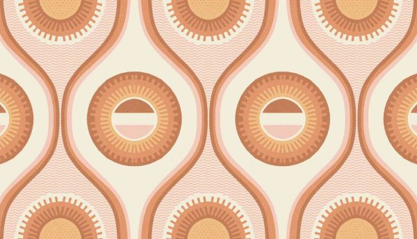 This design exudes a distinct retro feel thanks to the graphic pattern of radiant circles reminiscent of stylized suns. The composition is built up of warm earth tones such as terracotta, powder pink, sand, and soft cream, which together evoke a harmonious and nostalgic atmosphere. The repeating circles are surrounded by fine line structures and wavy shapes, giving the whole a dynamic yet balanced rhythm. Perfectly fitting in a retro or mid-century modern interior, this design truly comes into its own in spaces that exude boldness and character. Think of a seating area with velvet armchairs, round coffee tables, brass accents, and dark wood furniture. This design can also surprisingly work well in a bohemian style, for example in combination with rattan, pottery, and natural materials. The warm colors and flowing patterns make it particularly suitable for lively spaces such as a living room, dining room, or creative workspace. The design creates an inviting and energetic atmosphere that still maintains tranquility through the soft color gradients and symmetrical repetition. For a contemporary twist, pair it with plain, modern elements: a sleek sofa in beige linen, abstract wall art, and subtle copper details. This balance between retro design and modern simplicity makes it a versatile addition to various interior styles.