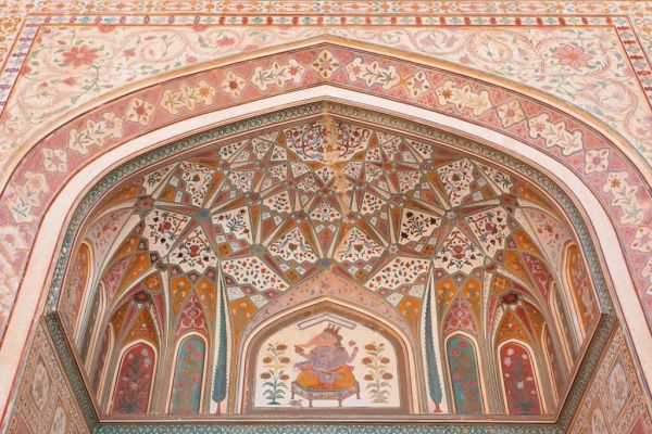Photo wallpaper with a richly painted arch of a castle in India with orange, red tones. In the middle at the bottom, an elephant is visible.