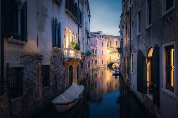 This design brings to life the enchanting atmosphere of a Venetian canal, where the evening twilight and warm lighting create a magical contrast. The historic facades, with their weathered bricks and ornate balconies, exude a timeless elegance. The reflections of the atmospheric lamps on the calm water enhance the romantic appeal and give the image an almost painterly quality. The warm golden hues from the illuminated windows and balconies subtly blend with the deep blue tones of the evening sky and water, creating a harmonious and serene ambiance. This design fits perfectly in interiors that aim to create a romantic, elegant, or nostalgic look. In a classic interior, it can be beautifully combined with dark wood tones, vintage furniture, and soft fabrics like velvet and linen. In a modern or minimalist interior, it forms a fascinating contrast with clean lines and subdued colors, while in a bohemian setting, it enhances the dreamy atmosphere. For a luxurious appearance, it can be paired with marble accents and warm lighting. The romantic and intimate look makes this design ideal for living rooms, bedrooms, and stylish hospitality venues that want to exude Venetian charm. Urbex and urban photography often capture the hidden beauty of abandoned or historic places, and this design translates that magic into a timeless and atmospheric interior. A perfect choice for lovers of Venice, warm evening light, and the nostalgia of a quiet canal.