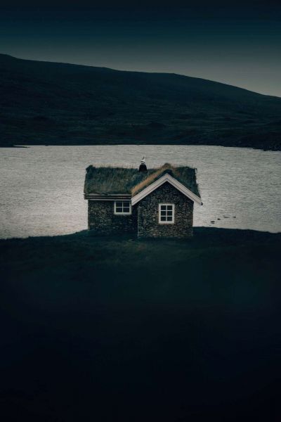 A lonely stone cottage with a grass roof stands at the edge of a quiet pond. The dark hills in the background and the cool light above the water create a calm, mysterious atmosphere full of simplicity and natural tranquility.