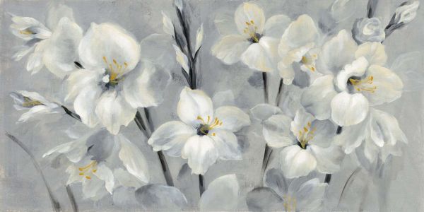 Elegant white blossoms unfold against a misty gray background. The subtle brushstrokes and light yellow accents give the whole a calm, refined atmosphere full of softness and harmony.