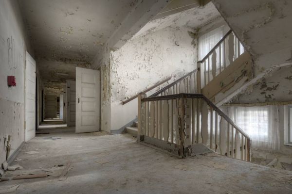 Treppenhaus in einem ehemaligen Skihotel. In vielen Räumen hingen immer noch schöne Lichter. Sie werden wahrscheinlich zugrunde gehen, wenn das Gebäude zusammenbricht.