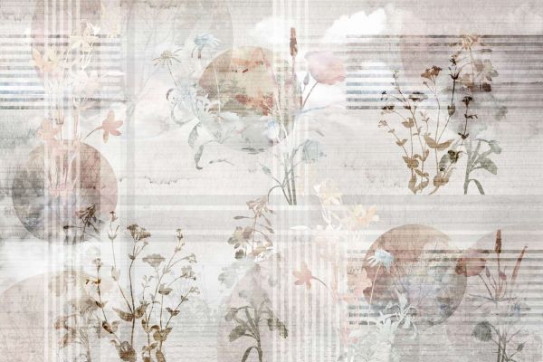 A serene scene in which elegant cranes float through soft pastel colors and delicate flowers, or an abstract interpretation of nature with layered flowers and geometric patterns. These designs create tranquility and sophistication with their subdued color palette and refined details.
