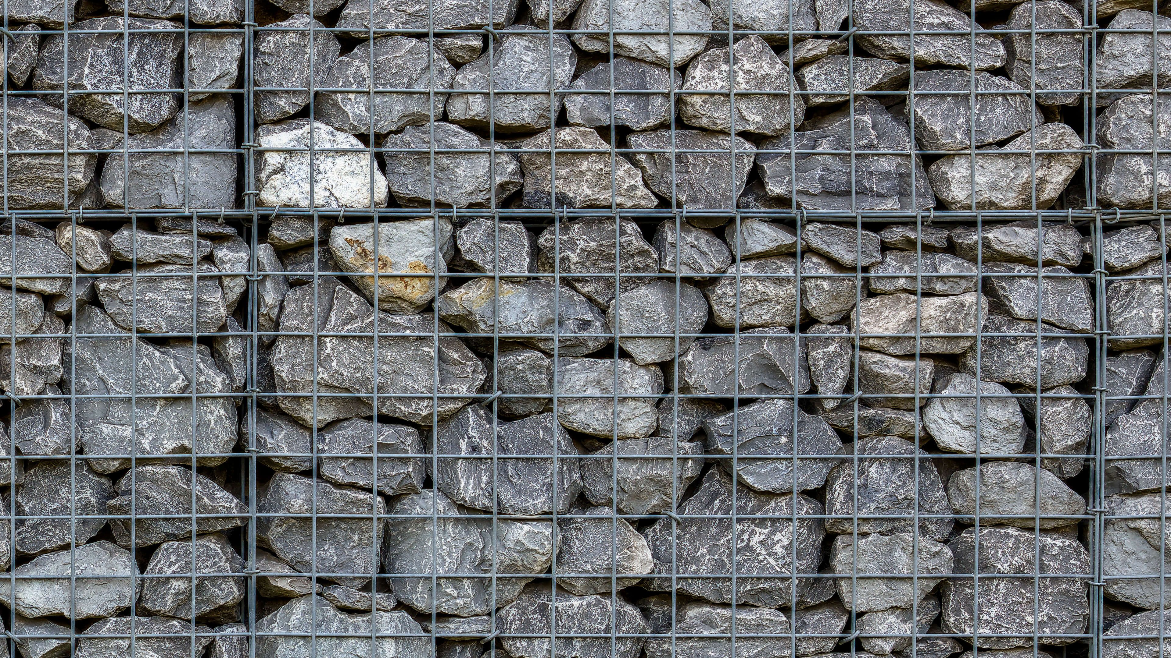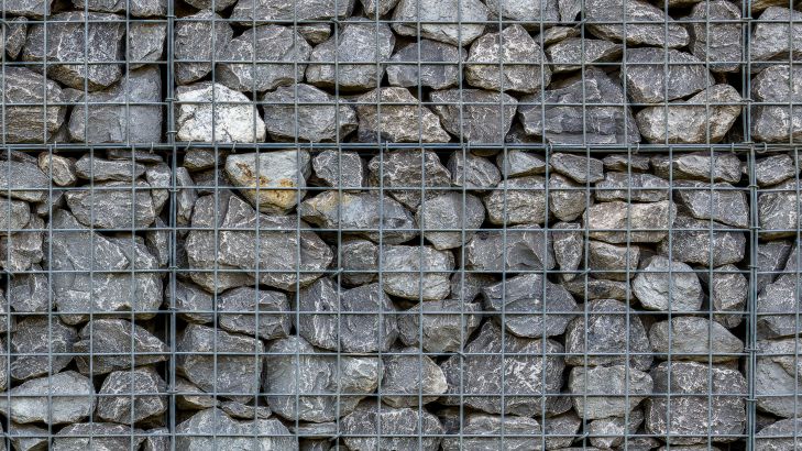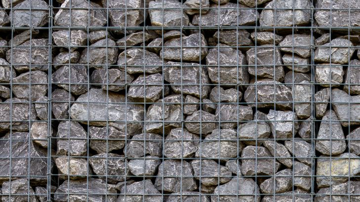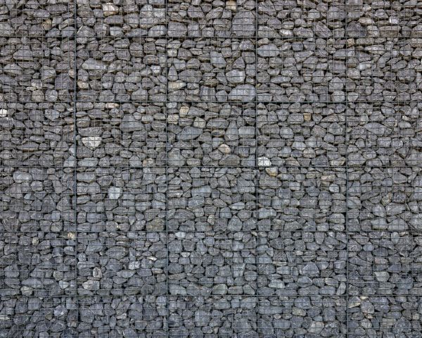 Stacked grey stones behind metal grid (baskets)