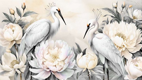 Two elegant cranes wandering among peonies in a palette of taupe, gray-green, and soft earth tones. The subtle color gradations and finely drawn contours create a restrained yet refined appearance.