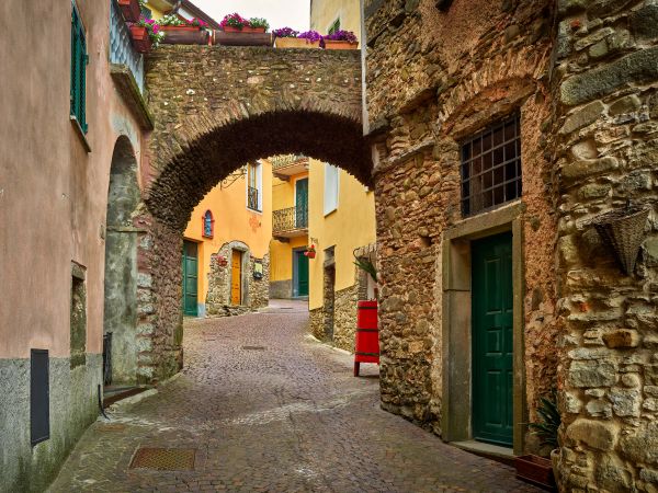 Beautiful street with archways and coloured houses. It is as if you can walk from the room into this street.