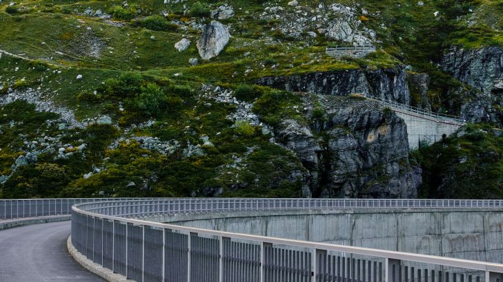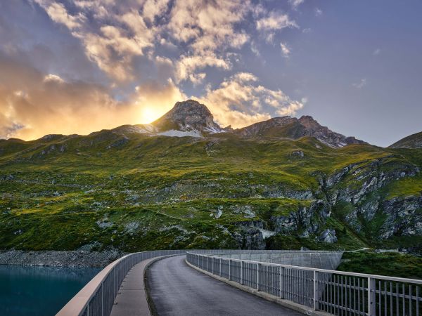 Beautiful sunset by the lake. With this photo wallpaper in your home, it's as if you can walk across the bridge.