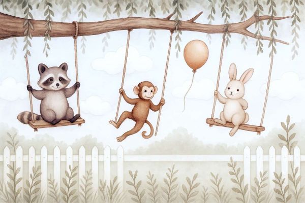 In this lovely image, three animal friends peacefully swing back and forth on wooden swings, hanging from a sturdy branch full of hanging greenery. A mischievous monkey, a curious raccoon, and a calm bunny visibly enjoy the moment. Floating between them is an orange balloon gently rising, while clouds drift by against a light blue sky. A white garden fence and graceful plants complete the tranquil, garden-like atmosphere.