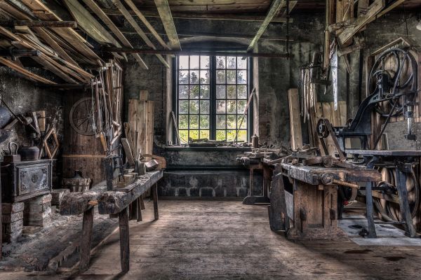 Ich finde, es ist eine wunderschöne Fototapete eines alten Möbeltischlers. Ich habe diese Tapete in meinem Hobbyraum angebracht.