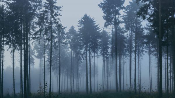 A foggy and gray landscape filled with tall trees.