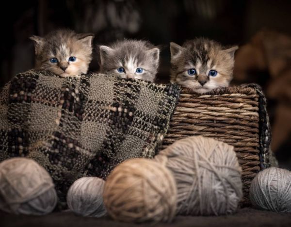 Three sweet kittens in a basket on photo wallpaper. Beautiful warm colours and in the foreground balls of wool for the kittens to play with.
