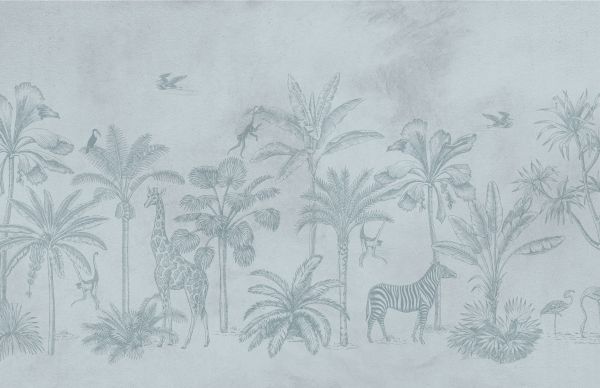Tropical animal jungle in blue. Use this wallpaper to complete your children's room.