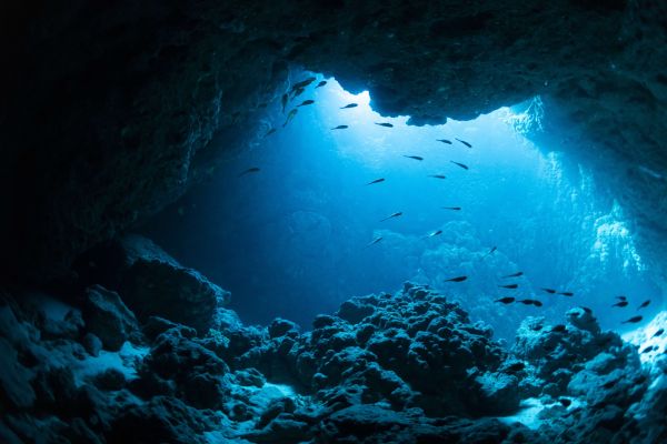 Underwater cave with fish