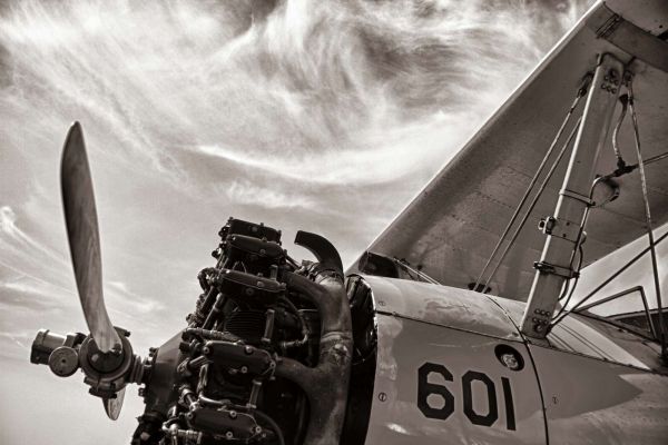 Detailed black and white composition of a classic propeller airplane against a dynamic cloud cover. A powerful mix of technology, nostalgia, and airy movement.