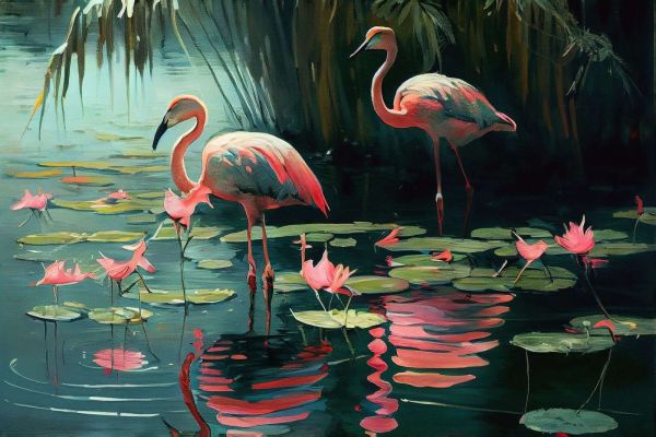 In this peaceful oasis, flamingos elegantly wade between blooming water lilies. The subtle reflections in the calm water and the scattered pink petals add a delicate beauty to this serene scene.