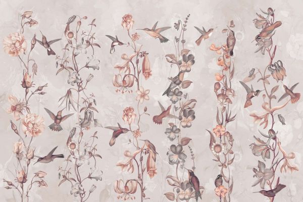 Een romantisch en verfijnd tafereel van sierlijke kolibries die zweven tussen gedetailleerde bloemenranken. De zachte beige achtergrond versterkt de warme tonen van perzik, bruin en grijstinten, waardoor een dromerige en nostalgische uitstraling ontstaat. De delicate illustraties zorgen voor een tijdloze elegantie en een vleugje natuur in elke ruimte.