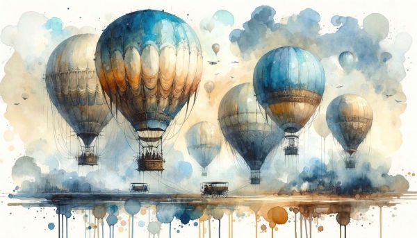 Een betoverende aquarel van luchtballonnen die boven een zacht wolkendek zweven. Het gebruik van blauwe en beige tinten creëert een serene en nostalgische sfeer. De subtiele details en abstracte verfspatten brengen beweging en luchtigheid in dit dromerige tafereel.