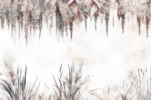 Een elegant en rustgevend ontwerp waarin hangende blauweregenbloemen en wuivend wildgras samenkomen in een zachte aquarelstijl. De tinten van beige, sepia en grijs creëren een natuurlijke en dromerige sfeer, terwijl de subtiele overgangen en lichte achtergrond een serene uitstraling geven.