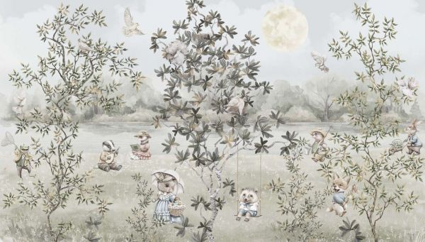 This heartwarming illustration depicts an idyllic scene filled with charming woodland animals enjoying a summer day by the shore of a tranquil lake. The scene is rich in detail and full of life: a hedgehog swings from a branch, a badger plays the mandolin, a frog chases with a butterfly net, and rabbits tend to their garden or read in the grass. Each animal is dressed in nostalgic, rural clothing, contributing to the vintage and rustic atmosphere. The color palette consists of soft greens, warm beige, muted blue, and light brown. These natural and subtle colors create a calm, friendly appearance that seamlessly fits with Scandinavian or country interiors. Think of wooden furniture, light linen fabrics, and rattan accessories to enhance this ambiance. With its rich detail and fairy-tale character, this illustration is perfect for children's rooms, playrooms, or even a reading nook. Combined with natural wood bookshelves, woven storage baskets, and cozy cushions, the space becomes an inviting place where children can lose themselves in stories and play. The trees, birds, flowers, and babbling river in the background evoke a sense of peace and connection with nature. The scene radiates a nostalgic and almost timeless feeling – as if you are flipping through a children's book. At the same time, the characters and their activities stimulate the imagination and encourage creative play.