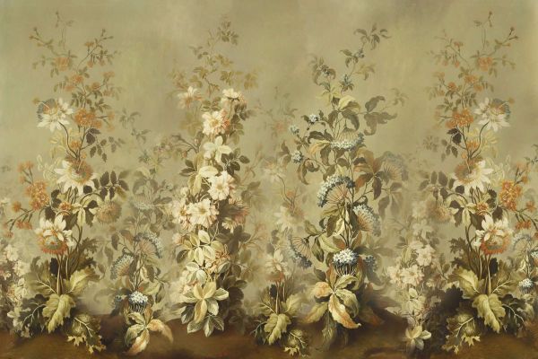 This design breathes the timeless beauty of a classic botanical garden. A harmonious mix of clematis and other flowers is presented in soft shades of gold, sepia, and brown, with subtle hints of cream and blue. The delicate blur of the background creates a soft, dreamy atmosphere, while the detailed brushstrokes emphasize the natural elegance of the flowers. This design evokes the nostalgia of old master paintings and exudes a restrained luxury. Ideal for classic and country interiors. In a classic interior, this design makes an elegant statement, especially in combination with antique furniture, heavy fabrics, and warm wood tones. For a country style, it adds a rustic yet refined element, combined with natural materials such as linen and rattan. Suitable for spaces such as a dining room, living room, or a stylish library. The design brings a sense of warmth and tranquility to any space while adding a touch of historical charm. The versatility in colors and patterns makes it easy to combine with different styles and decorative elements, making it a timeless choice for a refined decor.