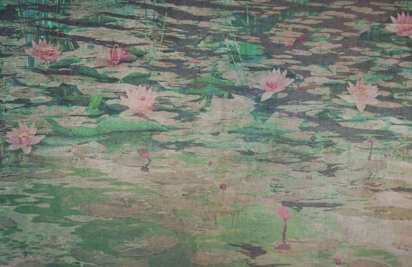 An enchanting scene of a soothing pond full of water lilies forms the basis of this design. Soft pink flowers float among the floating leaves that cover the water in varying shades of green. The background is subtly layered with a weathered texture, giving the whole a nostalgic, almost impressionistic character. The image evokes memories of Monet's paintings, but with a contemporary twist in color and atmosphere. This design comes into its own within a classic romantic or nature-inspired interior style. In a classic setting, it forms an elegant resting point in combination with graceful furniture, warm wooden accents, and textiles in old pink or sage green. In a natural interior, it fits perfectly with light wood types, rattan accessories, large houseplants, and linen fabrics, subtly bringing the outside world inside. The color scheme consists of muted green tones, soft pink accents, and natural brown-beige shades, which together create a calming atmosphere. This makes the design ideal for spaces such as a bedroom, reading nook, or meditation room, where relaxation and harmony are central. The playful composition of leaves and flowers spread across the water surface brings movement and depth to the space without being overwhelming. Due to the light use of color and artistic finish, the design feels airy but with enough detail to make a lasting impression.