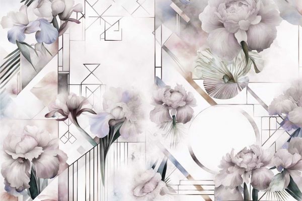 A serene design in which graceful irises and peonies merge with geometric Art Deco lines. The soft shades of sepia, beige, and gray create a calming and dreamy atmosphere, while the subtle brushstrokes and graphic accents give the whole a modern yet vintage look.