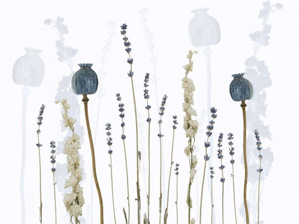 A dreamy collection of flora, presented with a watercolour-like softness. The image composition shows poppy bulbs and lavender, whose shades from sky blue to cloud-like white form an ethereal garden. The translucent background and overlapping elements suggest a dreamy, peaceful state that invites reflection and calm.