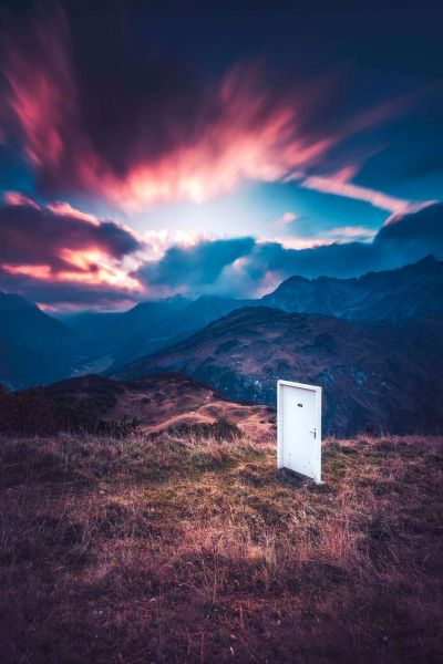 A surreal mountain landscape at sunset with a lonely white door in the middle of nature. The color play of purple, blue, and pink emphasizes the mysterious, almost magical atmosphere of the scene.