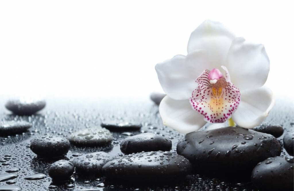 Photo wallpaper of a white orchid with a pink center on black boulders. On the stones are drops of water.