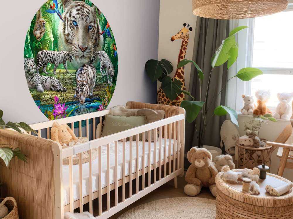 This fascinating design brings the mystique of a tropical temple to life, with white tigers as the main characters in this exotic oasis. A large tiger head with intense, bright blue eyes dominates the image and radiates strength and tranquility. Surrounding these majestic animals is a vibrant scene with tropical flowers, hanging vines, and lush vegetation. In the background, a weathered temple rises, adorned with mysterious patterns and ancient symbols, while parrots with their bright colors dance through the air. The tigers walk and rest on the stone steps of the temple, while one tiger gazes at its reflection in the water. The crystal-clear water is surrounded by beautiful water lilies and colorful fish, adding extra liveliness to the scene. This design is perfect for interiors that want to combine mystery and nature. It is particularly suitable for spaces such as living rooms, studies, or relaxation areas, where it adds a serene and adventurous atmosphere. Combine it with green and earth tones for a natural look, or add golden accents to enhance the temple-like ambiance. The balance between the calmness of the white tigers and the vibrancy of the flowers and birds makes this design ideal for transforming a space into a tropical dream. Let yourself be inspired by the harmony of nature, animals, and culture in this unique scene!